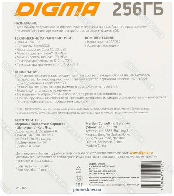 Карта памяти Digma MicroSDXC Class 10 Card30 DGFCA256A03, Киев, Украина.Бренд: Digma Зимняя скидка 2025 г.: 10%, экономия: 57 ₴