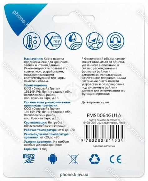 Карта памяти Flexis microSDHC 64GB Class 10 U1 FMSD064GU1A, Киев, Украина.